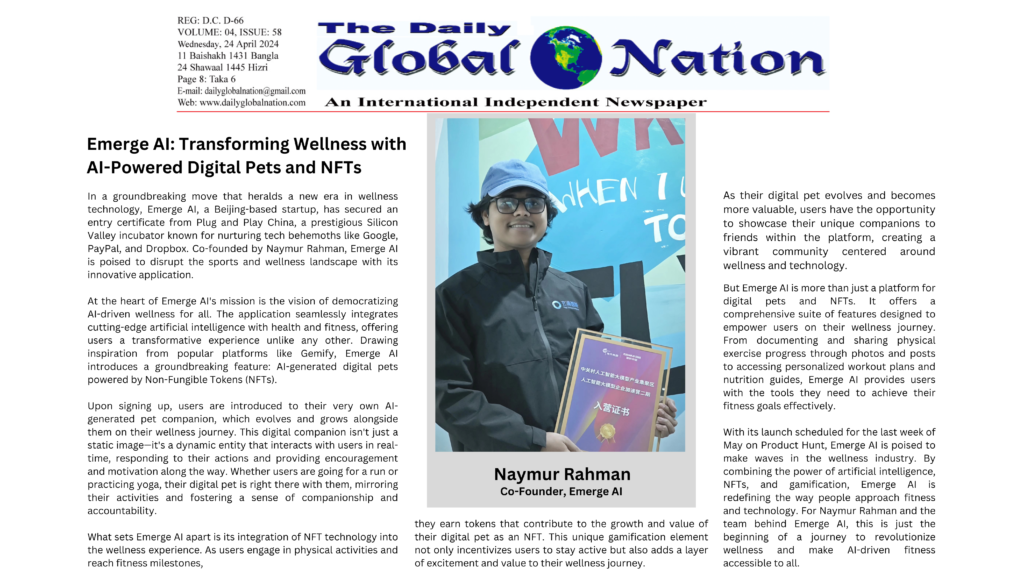 In July 2024, I launched Emerge AI on ProductHunt, and we proudly secured the #7 spot of the day. It was an exciting moment for the team, and seeing the app gain such attention felt like all the hard work had paid off. The launch also caught the eye of The Daily Global Nation, an international English newspaper, which highlighted our innovative approach to AI-powered wellness. That was a great way to end an already exciting day.
